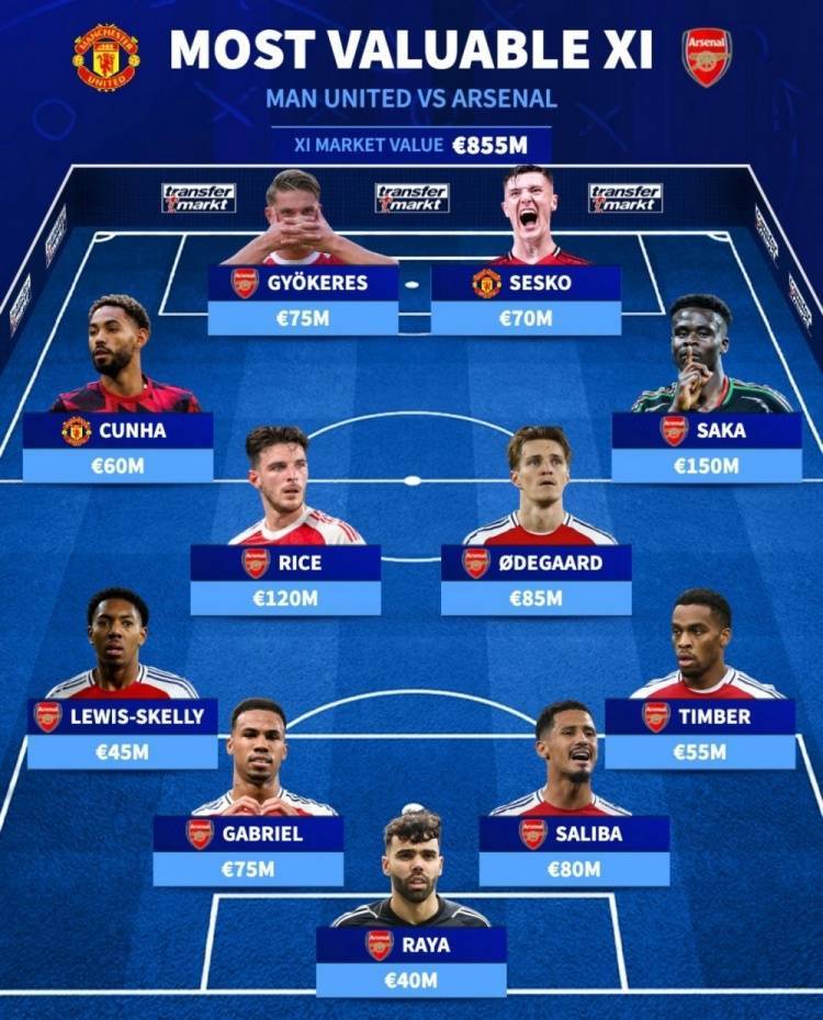 德转列曼联+阿森纳身价最高阵:萨卡领衔阿森纳9人,塞斯科在列